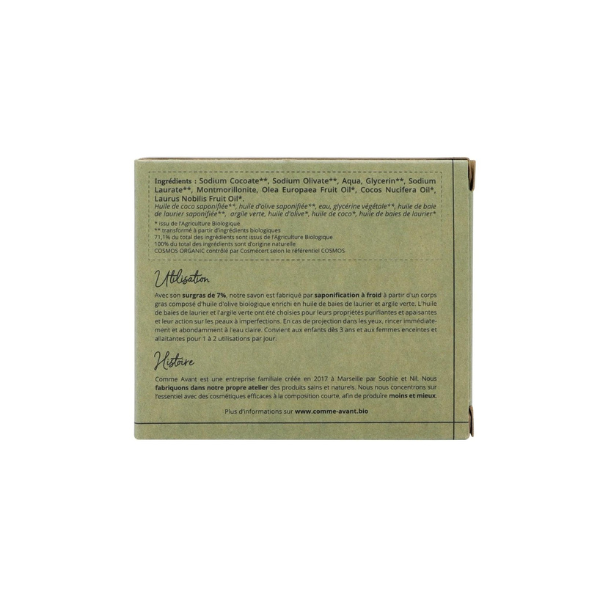 Composé d'huile de baies de laurier et d'argile verte, ces deux ingrédients ont été choisis pour leurs propriétés purifiantes et apaisantes et leurs actions sur les peaux à imperfections, les peaux grasses ou atopiques.